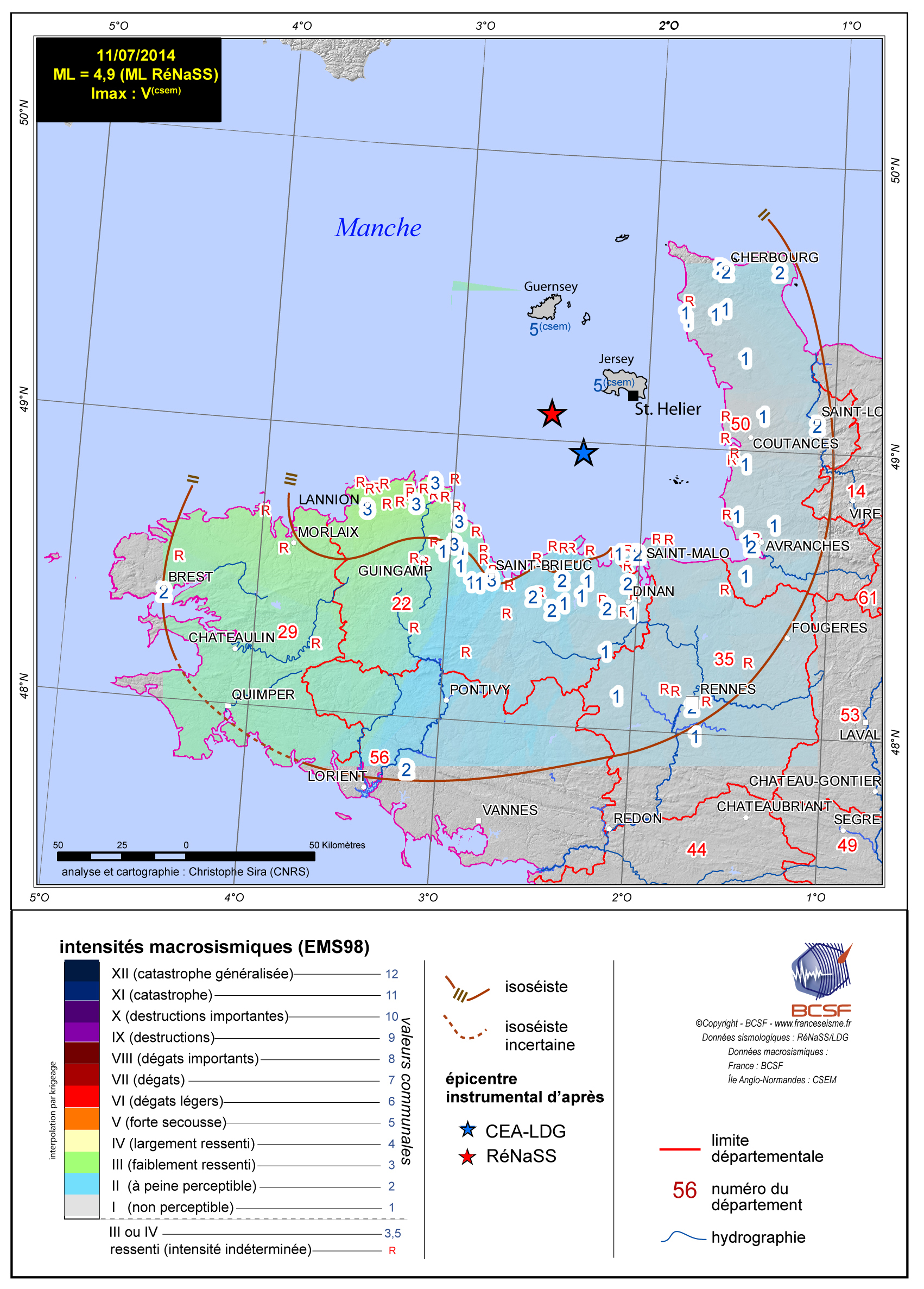 Séisme 30 km au SW de St-Helier (le 11/07/2014 à 13h54 heure FR, ML=4,8) selon le CEA-LDG