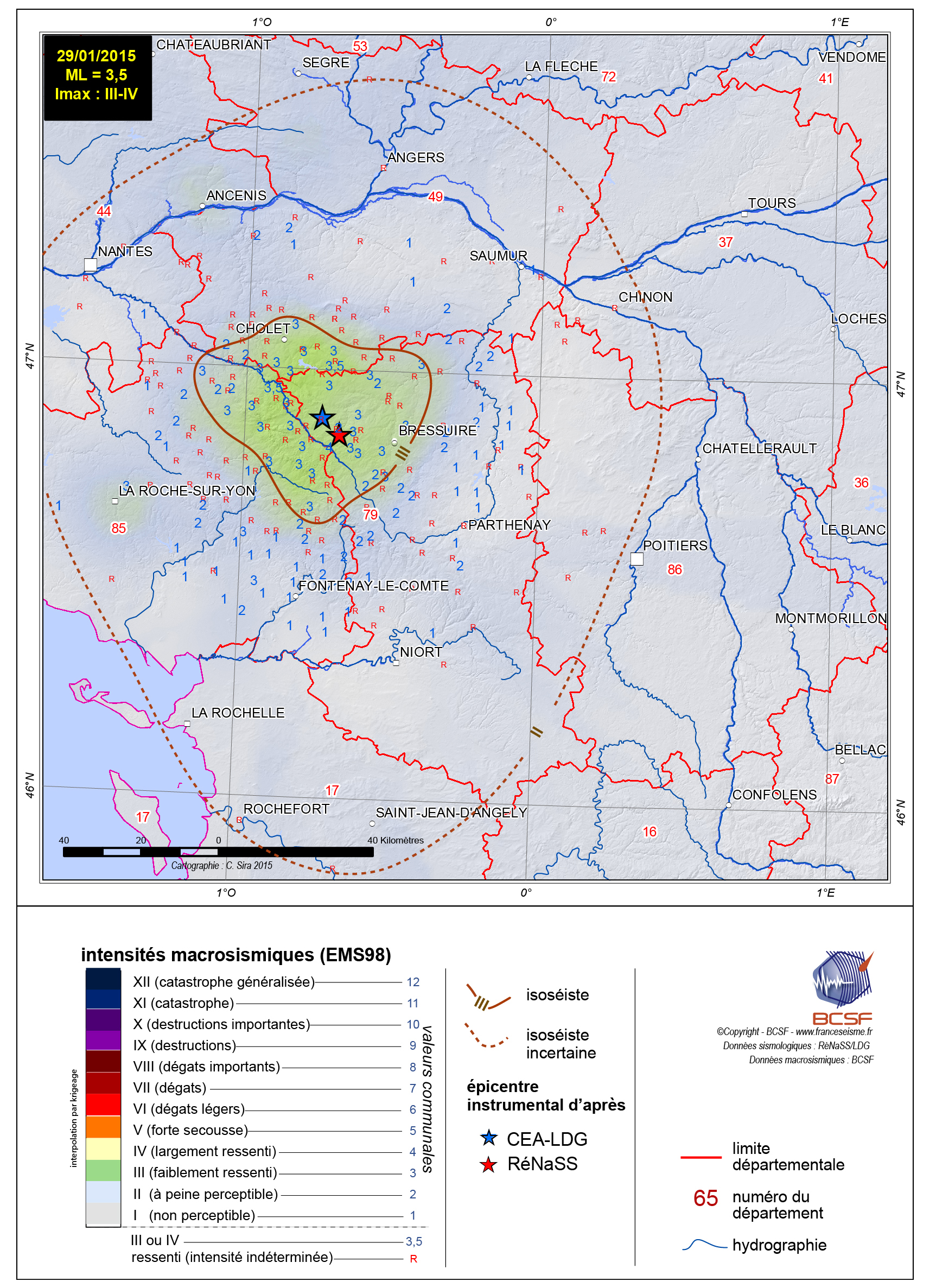 Séisme NW de Bressuire (dépt. 79,le 29/01/15 à 21h21 heure fr, ML= 3.5) selon BCSF-RENASS