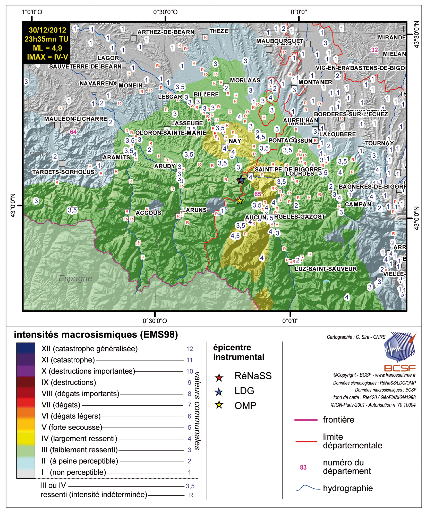 Séisme SE de Pau (dept. 64, le 31/12/12 à 00h35 heure locale, magnitude 4.9) selon RENASS